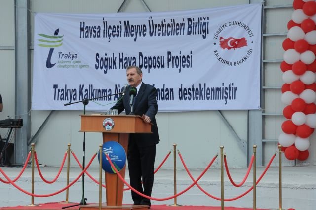 Trakya Kalkınma Ajansı’nın desteğiyle kurulan Trakya Bölgesi’nin en büyük soğuk hava deposu düzenlenen törenle hizmete açıldı. Havsa İlçesi Meyve Üreticileri Birliği’nin projesi ve TRAKYAKA’nın 2010 Yılı Mali Destek Programları kapsamında sağladığı destekle inşa edilen deponun açılışına Edirne Valisi Gökhan Sözer, Ak Parti Edirne Milletvekili Mehmet Müezzinoğlu, CHP Edirne Milletvekili Recep Gürkan, Havsa Kaymakamı Barış Demirtaş, İlçe Jandarma Komutanı Yüzbaşı Musa Uludağ, Havsa Belediye Başkanı Oğuz Tekin, Edirne İl Özel İdaresi Genel Sekreteri Ahmet Çetin, Trakya Kalkınma Ajansı Genel Sekreteri Mehmet Gökay Üstün, daire amirleri, Meyve Üreticileri Birliği üyeleri ve Kuzucu Köyü sakinleri katıldı.