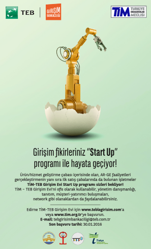 Edirne TİM TEB Girişim Evi'nde iş fikrini girişime dönüştürmeyi başarmış ve şirketleşme sürecini yeni tamamlamış olan girişimcilerimiz için kuluçka programımız “Start Up” programı kapsamında destekler veriyoruz. Tanımlı ürün/hizmet geliştirme çabası içerisinde olan, AR&GE faaliyetleri gerçekleştirmenin yanı sıra ilk satış çabalarında da bulunan, cirosu 500 bin TL’yi aşmayan işletmelere ürün segmentasyonlarının belirlenmesi, doğru müşteri kitlesinin tespiti ve nakit akışı sağlanması konularında danışmanlık sağlıyoruz. Pazarlama, satış, insan kaynakları yönetimi gibi işletme faaliyetlerinin yönetilmesi ve tanımlı hale getirilmesine destek oluyoruz.