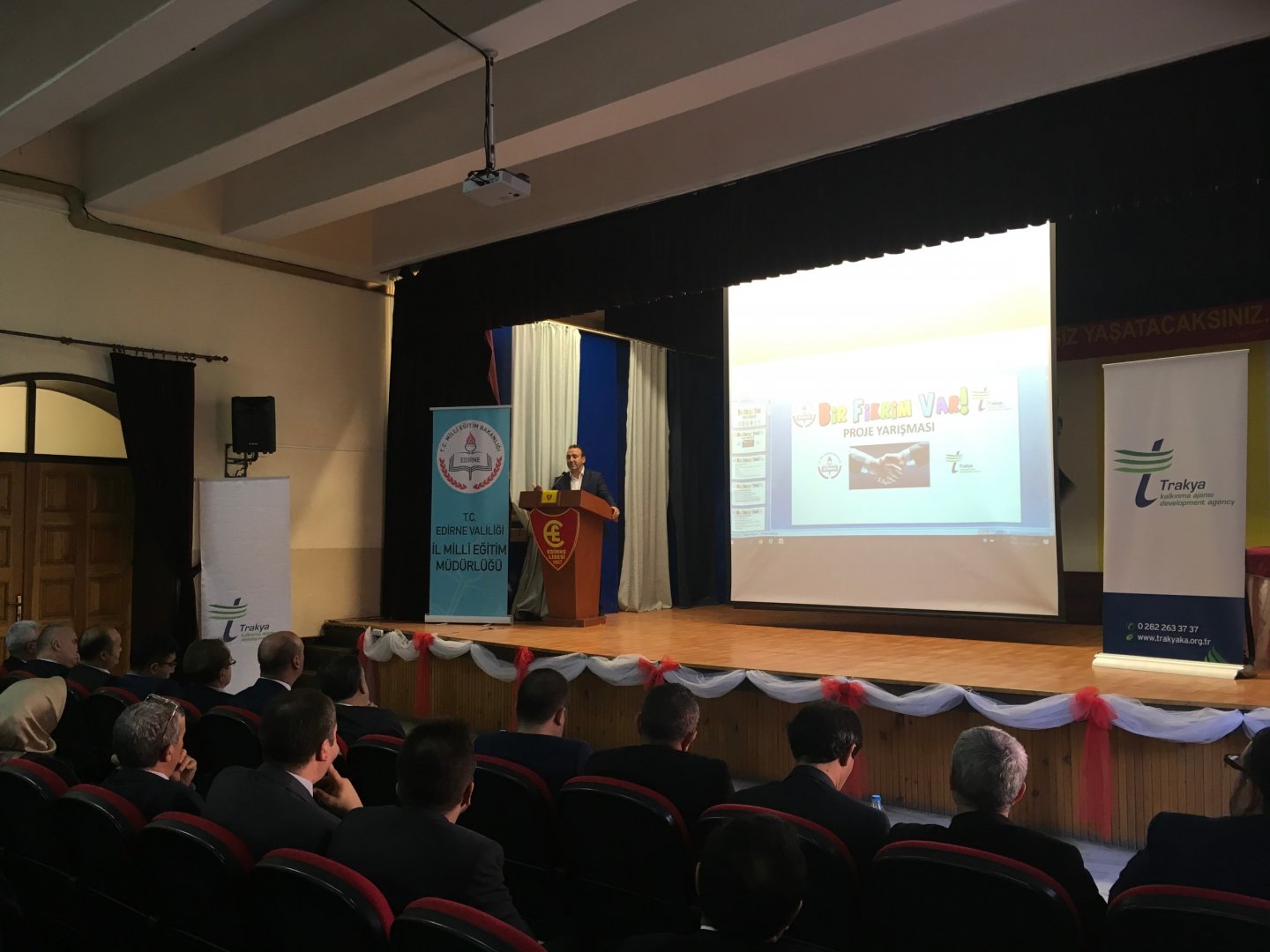 Edirne Lisesi konferans salonunda gerçekleşen tanıtım toplantısına, Vali Yardımcısı Dr. Yusuf Güler, Trakya Kalkınma Ajansı Genel Sekreteri Mahmut Şahin, İl Milli Eğitim Müdürü Hakan Cırıt, İlçe Milli Eğitim Müdürleri ve ortaöğretim okullarının yöneticileri katıldı. Tanıtım toplantısında konuşma yapan Genel Sekreter Mahmut Şahin ‘’Bir Fikrim Var’’ projesinin Trakya ve Türkiye için önemli bir proje olduğunu vurguladı. Şahin, konuşmasının devamında şunları söyledi: ’’Proje ile öğrencilerimiz birçok alanda yaptığı teorik ve pratik çalışmalarını uygulamaya dökebilecek. Çocuklarımız evde, okulda ve sosyal hayatın içerinde hep teorik olarak bir şeyler öğreniyorlar. Bunların uygulaması nasıl olur, acaba nasıl hayata geçirebiliriz diye düşünüyorlardı. Bu proje onların bu fikirlerini ve yaptıkları çalışmaları hayata geçirebilmelerine olanak sağlayacak. Tabi her projede danışman öğretmenlerimiz olacak ve öğrencilerimize yol gösterecek. Bu projenin en önemli çıktıları öğrencilerin bir projeyi hayata geçirmeyi öğrenecek olması ve ekip çalışması alışkanlığı kazanması. Kendisini çözümün bir parçası olduğu anlayan genç daha da özgüvenli olacak. Ve daha azimli bir şekilde çalışacak. Ülkesine milletine faydalı bir birey olacak. ‘’Bir Fikrim Var’’ Projesi Edirne, Tekirdağ ve Kırklareli illerinde ortaöğretim kurumlarında öğrenim gören öğrencilerimizi kapsıyor. Birkaç gün evvel Tekirdağ için tanıtım toplantısı gerçekleştirildi ve önümüzdeki hafta Kırklareli’nde de bir tanıtım toplantısı düzenleyeceğiz. Bölgemizde ortaöğrenim kurumlarının yeni proje fikirlerini hayata geçirecek ve proje kültürünün oluşmasını sağlayacak böylesine anlamlı bir organizasyona destek vermekten ötürü Ajans olarak çok mutluyuz. Burada emeği geçen herkese teşekkür eder, projenin Bölgemize hayırlı olmasını dilerim.’’